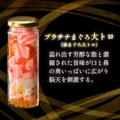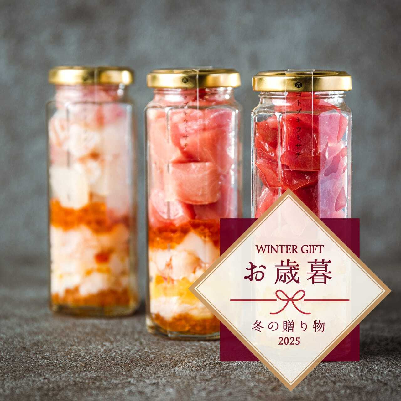 美しいガラス瓶に、一人前ずつ丁寧に盛りつけられ、スイーツのように層を織りなす海の幸。