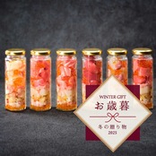 美しいガラス瓶に、一人前ずつ丁寧に盛りつけられ、スイーツのように層を織りなす海の幸。
